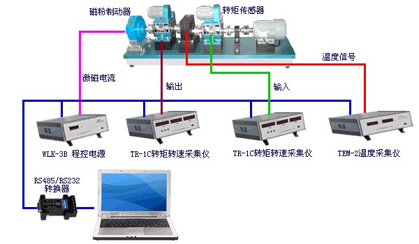 - 傳動(dòng)機(jī)械測(cè)量系統(tǒng)通過(guò)2臺(tái)相位差式轉(zhuǎn)矩轉(zhuǎn)速傳感器及2臺(tái)TR-1C轉(zhuǎn)矩轉(zhuǎn)速采集儀采集變速箱的輸入(輸出)轉(zhuǎn)矩和轉(zhuǎn)速;用1臺(tái)TEM-2溫度采集儀采集溫升;用WLK-3B程控電源控制磁粉制動(dòng)器對(duì)變速箱進(jìn)行加載。