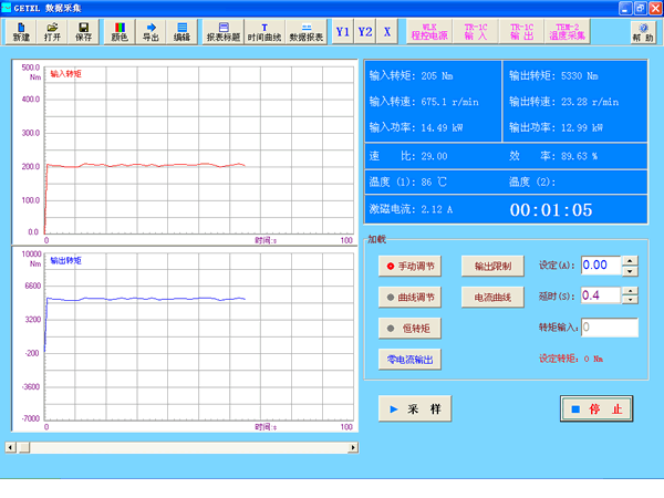 - 所有儀器通過(guò)RS485總線與電腦連接,實(shí)現(xiàn)對(duì)變速箱的自動(dòng)加載以及對(duì)數(shù)據(jù)的集中采集。實(shí)時(shí)顯示各參數(shù)與時(shí)間之間的關(guān)系曲線,以記錄整過(guò)測(cè)試過(guò)程。