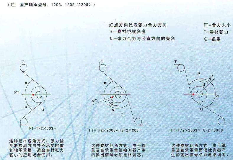 本傳感器采用應變片電橋測試原理,使用高精度結構設計。特別適合于張力傳感器需要伸出軸式安裝時使用。本張力傳感器能精確檢測出卷材通過張力滾時,施加在張力輥上的力,根據所受之力大小,輸出與之成正比的電壓信號。本傳感器承載具有方向性,紅點方向為合力方向。